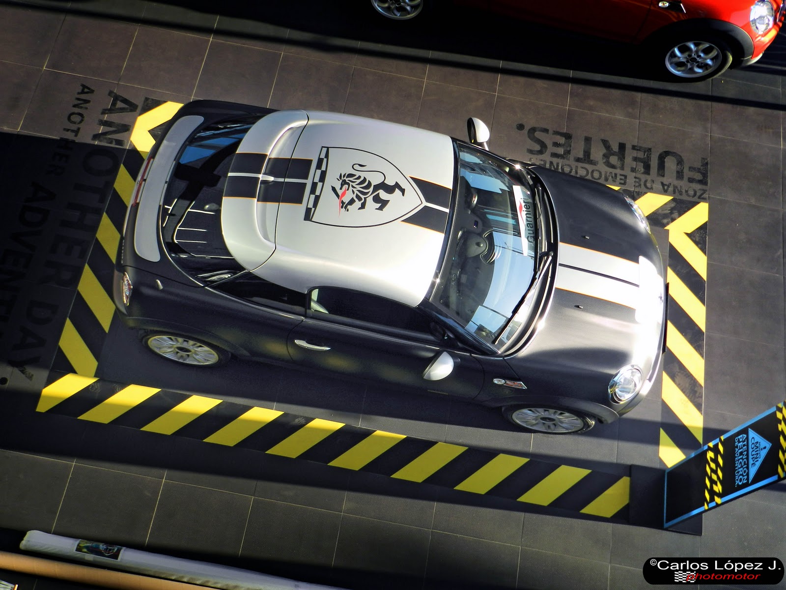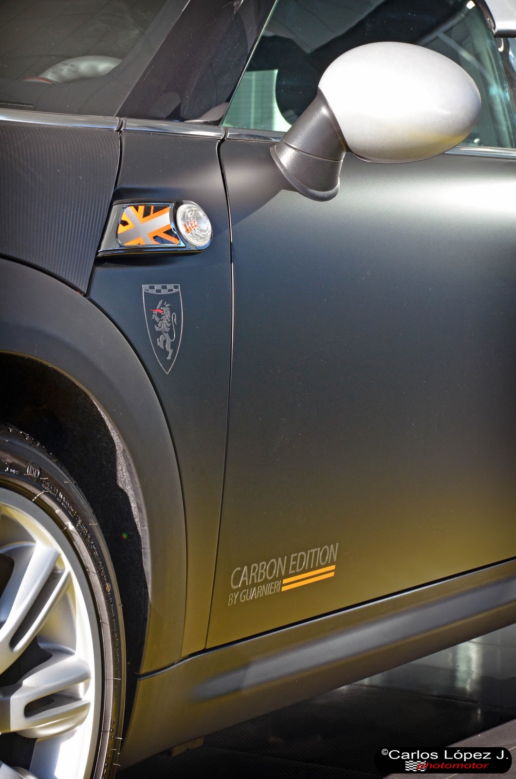 Esta versión personalizada y única, se presenta con carrocería negro mate satinado, techo plata, capó y portón trasero envueltos en fibra de carbono, elementos del Mini Coupé en aluminio cepillado y detalles en McLaren Orange.